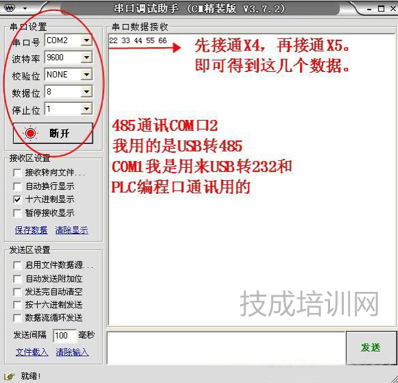 5、這些了解好之后,就開(kāi)始做一個(gè)簡(jiǎn)單的測(cè)試。PLC與電腦485連接。通過(guò)按鈕,驅(qū)動(dòng)RS指令,發(fā)送字節(jié)。電腦端通過(guò)串口調(diào)試助手接收數(shù)據(jù)。PLC程序如下: