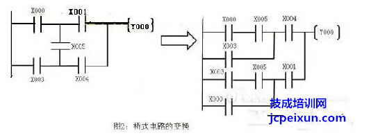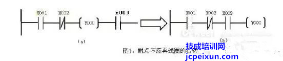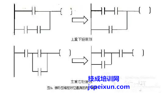 三,并聯(lián)塊串聯(lián)時(shí),應(yīng)將接點(diǎn)多的去路放在梯形圖左方(左重右輕原則);串聯(lián)塊并聯(lián)時(shí),應(yīng)將接點(diǎn)多的并聯(lián)去路放在梯形圖的上方(上重下輕的原則)。這樣做,程序簡(jiǎn)潔,從而減少指令的掃描時(shí)間,這對(duì)于一些大型的程序尤為重要。如下圖所示: