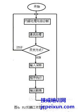 PLC的CPU采用循環(huán)掃描的工作方式。一般包括五個(gè)階段(如圖所示):內(nèi)部診斷與處理,與外設(shè)進(jìn)行通訊,輸入采樣,用戶程序執(zhí)行和輸出刷新。當(dāng)方式開關(guān)處于STOP時(shí),只執(zhí)行前兩個(gè)階段:內(nèi)部診斷與處理,與外設(shè)進(jìn)行通訊。
