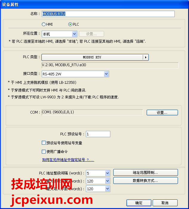 2、在打開的“設(shè)備屬性”中進(jìn)行設(shè)置本機(jī)PLC參數(shù),我們要設(shè)置設(shè)備的名稱、所在位置、PLC類型、接口類型等,這里以PLC類型為MODBUS RTU為例進(jìn)行設(shè)置,見下圖。