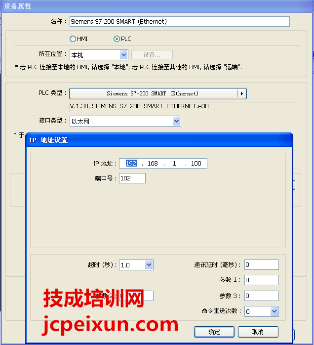 如果接口類型是以太網(wǎng)的,可以點(diǎn)擊對話框中的“設(shè)置”,打開“IP 地址設(shè)置”對話框,我們要正確設(shè)定PLC的IP地址和端口號。假如我們對PLC類型選擇為S7-200 Smart Ethernet,接口類型默認(rèn)就是以太網(wǎng)的。