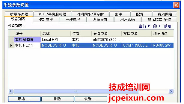 如果接口類型是USB,就不需再設(shè)定,檢查“設(shè)備屬性”內(nèi)的各設(shè)定值是否正確就可以了。在完成上述的各項(xiàng)設(shè)定后,在設(shè)備列表中可以發(fā)現(xiàn)新增了一個(gè)名稱為 “本機(jī) PLC 1”的設(shè)備,這樣就完成了觸摸屏控制一臺本機(jī)PLC所要進(jìn)行的參數(shù)設(shè)置。