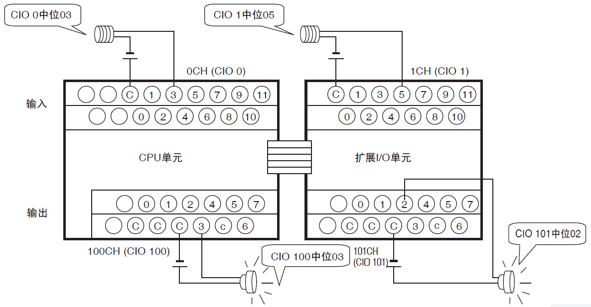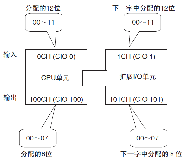 I/O 分配 歐姆龍將存儲(chǔ)器中的輸入/ 輸出位分配稱(chēng)之為“I/O 分配”。 擴(kuò)展I/O 單元上的輸入/ 輸出(I/O)為在CPU 單元上內(nèi)置I/O 分配字的后一字中分配I/O 位。