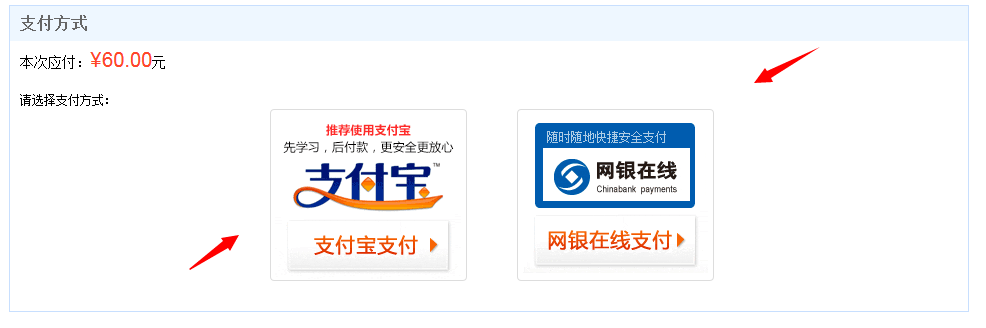 技成培訓(xùn)在線(xiàn)支付可使用“支付寶、網(wǎng)銀在線(xiàn)”兩種支付方式: