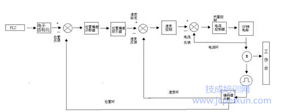 PLC發(fā)出指令脈沖數(shù)與編碼器檢查的位置反饋脈沖數(shù)同時送到伺服驅動進行比較運算,并求出偏差值存入位置偏差計數(shù)器內(nèi),經(jīng)過位置控制器進行位置增益運算,將運算的結果,即校正信號作為速度控制器的速度給定信號,再與編碼器檢測出的速度反饋信號進行比較運算,并求出速度偏差值,經(jīng)過速度控制器,進行Pi速度比例-積分運算,將運算出的結果,作為轉矩控制器即電流控制器的電流給定信號,在與電流傳感器檢測出的電流反饋信號給進行矢量控轉換之后,進行比較運算,并求出電流偏差值,經(jīng)過電流控制器,的矢量變量與功率放大,產(chǎn)生SPWM信號,控制 IGBT伺服逆變主回路,驅動伺服電機帶動機床工作臺朝著消除偏差的方向運動,由于位置指令是經(jīng)常變化的隨機變量,要求輸出量準確跟蹤給定定量的變化,因此,輸出響應的快速性、靈活性,準確性成為位置隨動控制系統(tǒng)的主要性能指標,為滿足這些指標的要求,采取由位置環(huán),速度環(huán)和電流環(huán)三環(huán)組成的控制系統(tǒng)