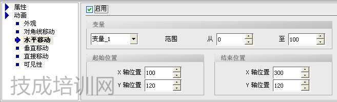 比如我們這里面選擇水平移動,那么我們需要啟用相應(yīng)的變量。這里面啟用的變量就是我們在點里面介紹的用來表示物體移動的變量VW0。設(shè)置好關(guān)聯(lián)的變量后,接著設(shè)置好移動的距離以及對應(yīng)的坐標軸。那么這些建立好后,我們只要在PLC的程序里面編寫一個使VW0的值在我們設(shè)定的范圍內(nèi)變化的程序,這樣就能實現(xiàn)物體的直線移動的效果。