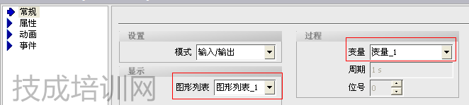 第四、在畫面上添加一個圖形I/O域。在其下面的屬性對話框中的“常規(guī)”選項里面關(guān)聯(lián)好建立的圖形列表,以及建立的變量MW0.如圖: