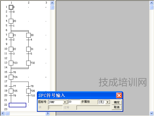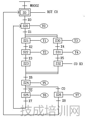 如圖1所示為一個含有分支流程的某控制系統(tǒng)的SFC程序。下面便以該SFC來講解在GX Developer中分支流程SFC的編輯。