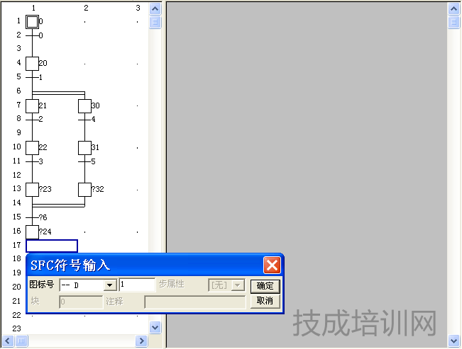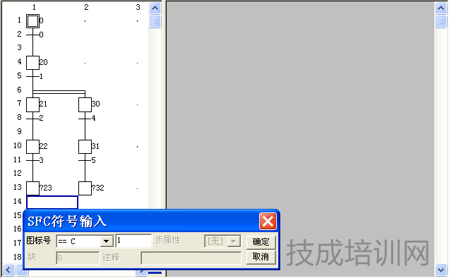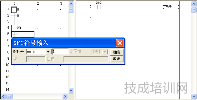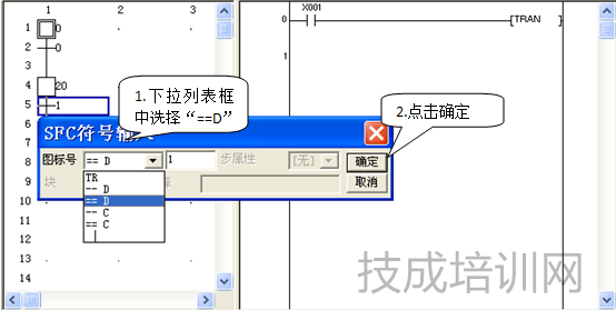 或者是雙擊轉(zhuǎn)移條件1彈出SFC符號輸入對話框,在圖標(biāo)號下拉列表框中選擇第三行“==D”項,單擊確定按鈕,如圖5所示。在下拉列表中,“--D”代表選擇性分支,“==D”代表并行性分支,“--C”代表選擇性匯合,“==C”代表并行性匯合。