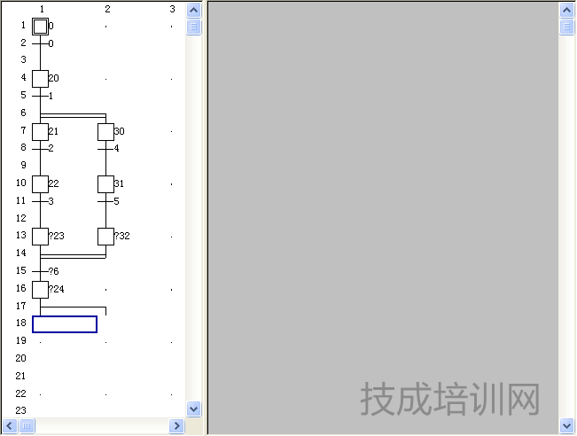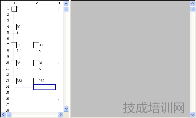 運行到X1為ON時程序開始分支,將光標(biāo)移到轉(zhuǎn)移條件1方向線