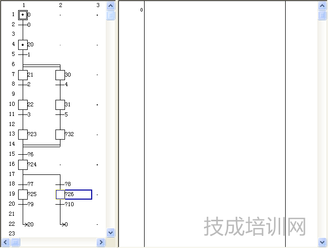 繼續(xù)輸入程序,接下來的狀態(tài)轉(zhuǎn)移程序輸入以及狀態(tài)輸出驅(qū)動的輸入與前面介紹的單流程結(jié)構(gòu)的SFC編程相同(因此,程序后部分便不再對狀態(tài)轉(zhuǎn)移程序輸入以及狀態(tài)輸出驅(qū)動輸入,所以步序圖標(biāo)號前面有問號(?))。直到進行并行性匯合,將光標(biāo)移到狀態(tài)框下面處,單擊工具欄中的并行性匯合寫入按鈕
