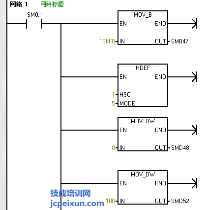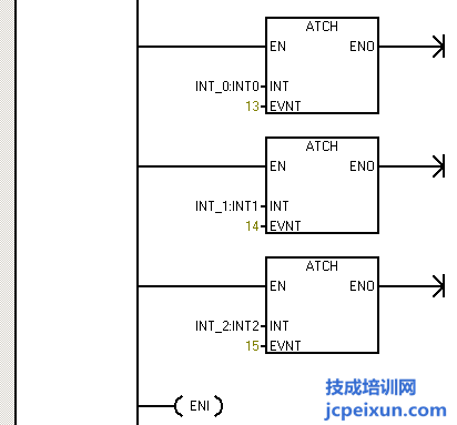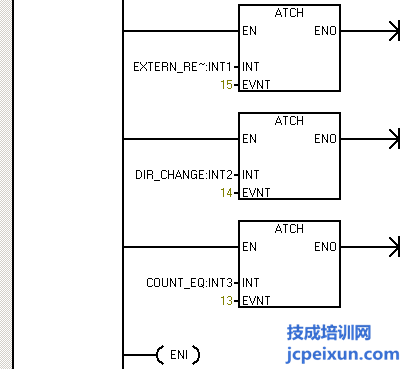 以上程序中,首次掃描首先傳送16#F8到SMB47定義控制字節(jié),然后執(zhí)行HEDF指令定義高速計(jì)數(shù)模式和選擇高速計(jì)數(shù)器,然后是寫(xiě)入初始值和預(yù)設(shè)值,然后是ATCH連接中斷程序0和中斷事件號(hào)13,那么就是為計(jì)數(shù)器當(dāng)前值CV等于預(yù)設(shè)值PV連接中斷,然后是一個(gè)ATCH連接中斷程序1和中斷事件號(hào)14,那么就是連接計(jì)數(shù)器方向改變中斷,然后又是一個(gè)ATCH連接中斷程序2和中斷事件號(hào)15,那么就是連接計(jì)數(shù)器外部復(fù)位中斷,建立連接中斷后要允許全局中斷,執(zhí)行ENI指令,后是激活高速計(jì)數(shù)器,執(zhí)行HSC指令。