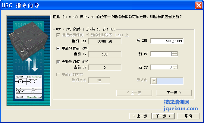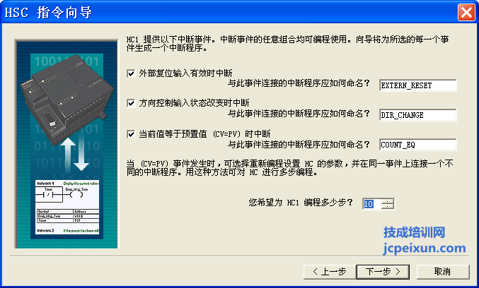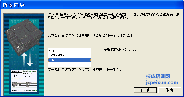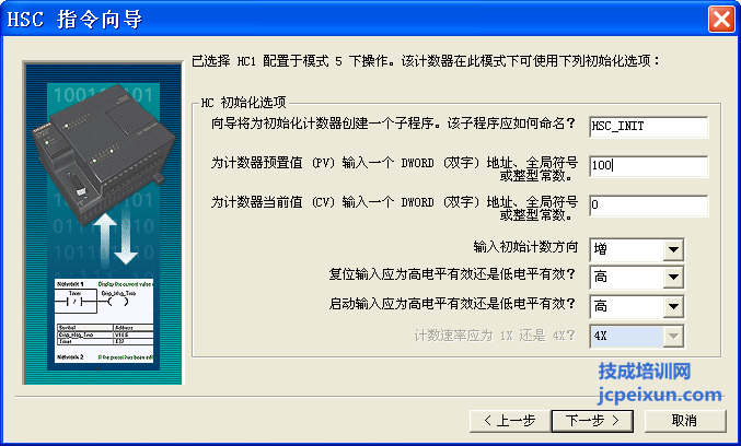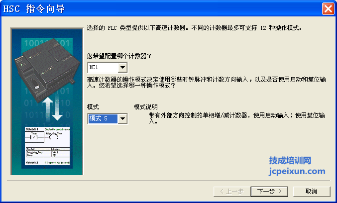 出現(xiàn)“HSC指令向?qū)А焙?,我們可以選擇配置哪個(gè)計(jì)數(shù)器和選擇哪個(gè)模式,這里我們選擇HC1和模式5,然后點(diǎn)擊下一步。