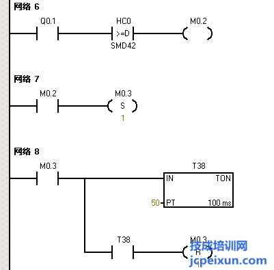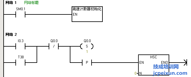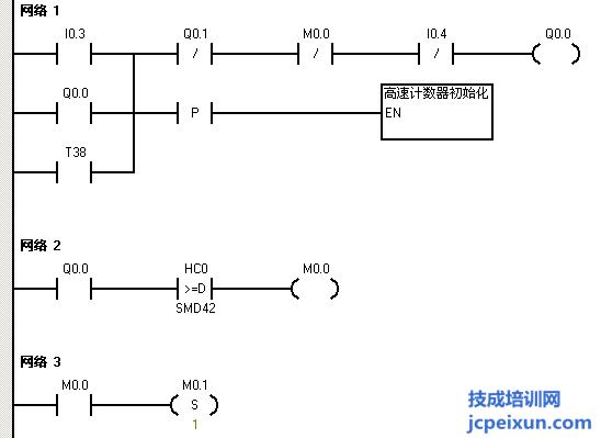 因?yàn)榭刂埔笫前聪聠?dòng)按鈕I0.3,Q0.0輸出,電機(jī)正轉(zhuǎn)。首先就做個(gè)起保停程序,I0.3啟動(dòng)串聯(lián)I0.4停止,來驅(qū)動(dòng)輸出Q0.0并做Q0.0的自鎖,同時(shí)做一個(gè)用I0.3的上升沿來調(diào)用高速計(jì)數(shù)器初始化子程序,注意這里的起保停是有做正反轉(zhuǎn)的互鎖的。然后再用Q0.0常開觸點(diǎn)串聯(lián)一個(gè)HC0大于等于SMD42的比較指令來輸出M0.0,并把M0.0的常閉觸點(diǎn)串聯(lián)在起保停程序中,作為高速計(jì)數(shù)器計(jì)到50個(gè)脈沖后電機(jī)停止。