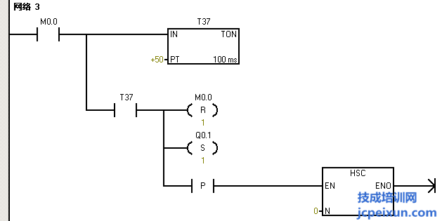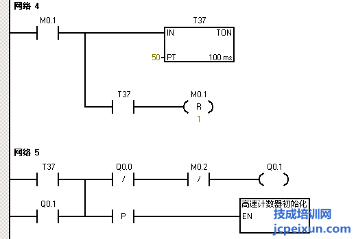 電機(jī)停止過5秒后Q0.1輸出,電機(jī)反轉(zhuǎn),那么我們就用M0.0來置位M0.1,再用M0.1常開觸點(diǎn)來驅(qū)動(dòng)來驅(qū)動(dòng)定時(shí)器T37延時(shí)5秒,并用T37常開觸點(diǎn)來驅(qū)動(dòng)復(fù)位M0.1,這里是為了讓定時(shí)器定時(shí)時(shí)間到時(shí)復(fù)位定時(shí)器。然后再用T37常開觸點(diǎn)來驅(qū)動(dòng)輸出Q0.1并做Q0.1的自鎖,同時(shí)也用T37的上升沿來調(diào)用高速計(jì)數(shù)器初始子程序。然后再用Q0.1常開觸點(diǎn)串聯(lián)一個(gè)HC0大于等于SMD42的比較指令來輸出M0.2,并把M0.2的常閉觸點(diǎn)串聯(lián)在起保停程序中,作為高速計(jì)數(shù)器計(jì)到50個(gè)脈沖后電機(jī)停止。