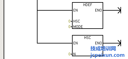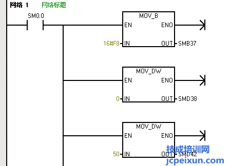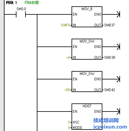 以上的程序中,首先做一個(gè)高速計(jì)數(shù)器初始化的子程序,首先是定義控制字節(jié),送16#F8到SMB37,定義為加計(jì)數(shù)更新當(dāng)前值,這里寫入初始值為0和預(yù)設(shè)值為50,定義的是高速計(jì)數(shù)器HSC0和HSC模式1,然后激活高速計(jì)數(shù)器。