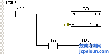 電機(jī)停止過5s后又開始電機(jī)的正轉(zhuǎn),那么我們就用M0.2來驅(qū)動(dòng)來驅(qū)動(dòng)定時(shí)器T38延時(shí)5秒,并用T38常開觸點(diǎn)來驅(qū)動(dòng)復(fù)位M0.2,這里也是為了讓定時(shí)器定時(shí)時(shí)間到時(shí)復(fù)位定時(shí)器。同時(shí)我們用T38常開觸點(diǎn)并聯(lián)在電機(jī)正轉(zhuǎn)的控制程序上,這樣可以實(shí)現(xiàn)循環(huán)。