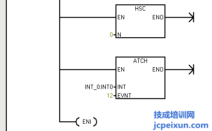 以上的程序中,首先做一個(gè)高速計(jì)數(shù)器初始化的子程序,首先是定義控制字節(jié),送16#F8到SMB37,定義為加計(jì)數(shù)更新當(dāng)前值,這里寫入初始值為0和預(yù)設(shè)值為50,定義的是高速計(jì)數(shù)器HSC0和HSC模式1,然后激活高速計(jì)數(shù)器,還做了高速計(jì)數(shù)器中斷,建立中斷程序0和中斷事件12的中斷連接,并全局允許中斷。