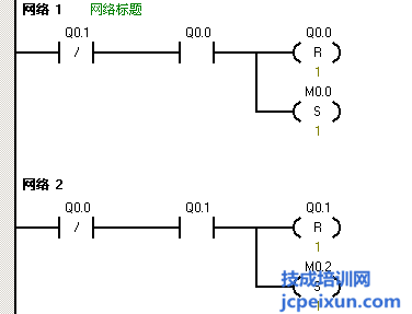 電機(jī)停止過5s后又開始電機(jī)的正轉(zhuǎn),那么我們就用M0.2來置位M0.3,再用M0.3常開觸點(diǎn)來驅(qū)動(dòng)來驅(qū)動(dòng)定時(shí)器T38延時(shí)5秒,并用T38常開觸點(diǎn)來驅(qū)動(dòng)復(fù)位M0.3,這里也是為了讓定時(shí)器定時(shí)時(shí)間到時(shí)復(fù)位定時(shí)器。同時(shí)我們用T38常開觸點(diǎn)并聯(lián)在電機(jī)正轉(zhuǎn)的控制程序上,這樣可以實(shí)現(xiàn)循環(huán)。