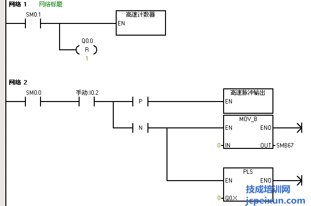 在主程序的網(wǎng)絡(luò)二中,用I0.2的上升沿才驅(qū)動(dòng)高速脈沖輸出子程序,用I0.2的下降沿來驅(qū)動(dòng)一個(gè)傳送指令,傳送0到SMB67,并同時(shí)驅(qū)動(dòng)一個(gè)PLS指令。在高速脈沖輸出子程序中,首先傳送16#85到SMB67中定義控制字節(jié),這里選擇的是PTO模式、單段、1us/周期、裝入周期和脈沖數(shù)的情況(控制字節(jié)的定義可以參考PTO/PWM控制字節(jié)表),并傳送100到SMW68中寫入周期值,傳送100到SMD72中寫入脈沖數(shù),后執(zhí)行PLS指令。