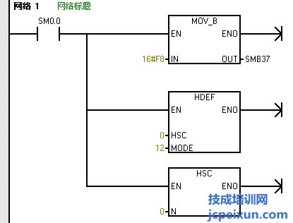 以上的程序,在主程序的網(wǎng)絡(luò)一中,首先用SM0.1首次掃描驅(qū)動(dòng)高速計(jì)數(shù)器子程序進(jìn)行高速計(jì)數(shù)初始化,同時(shí)對(duì)Q0.0的過程映像區(qū)清零。在高速計(jì)數(shù)器子程序中,首先傳送16#F8到SMB47定義控制字節(jié)定義為更新當(dāng)前值加計(jì)數(shù),然后執(zhí)行HEDF指令定義高速計(jì)數(shù)模式12和選擇高速計(jì)數(shù)器0,后是激活高速計(jì)數(shù)器,執(zhí)行HSC指令。