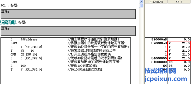 圖 2-1至圖 2-3所示程序的作用是將DB1.DBX0.0偏移2.0后的字的空間存放整數(shù)100也就是給DB1.DBW2賦值100,本身程序非常簡(jiǎn)單,也沒有什么實(shí)際意義,但是從這個(gè)程序中大家必須搞清楚兩個(gè)問題,圖 2-3中紅框中的地址V21.0是什么意思。第二Pointer參數(shù)類型是48位存儲(chǔ)空間的指針,48位的空間到底位于PLC的哪個(gè)存儲(chǔ)區(qū)。只要我們把這兩個(gè)問題搞懂了,就可以說對(duì)Pointer參數(shù)類型徹底搞懂了。