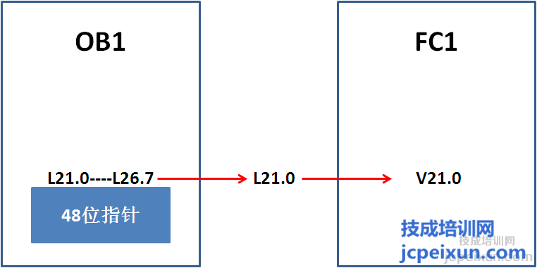 上面我們已經(jīng)分析出來FC1中的V21.0實(shí)際指的就是OB1中的L21.0因此我們可以判定Pointer參數(shù)類型的48位指針就是存放在OB1的L區(qū)中并且起始地址就是L21.0,由于是48位的空間所以Pointer參數(shù)類型的48位指針占用的就是OB1中的L21.0到L26.7共48位空間,其中LB21和LB22是存放DB塊編號(hào)信息的,LB23~LB26是存放地址信息的。
