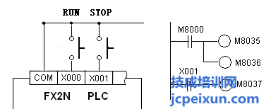 對于控制RUN狀態(tài)的開關(guān),只能使用X0~X7上的一個點,而對于控制STOP狀態(tài)的這個開關(guān)來說可以任選一個PLC的輸入點,在這里,我那選擇X0做為RUN的控制開關(guān),X1作為STOP的控制開關(guān)。