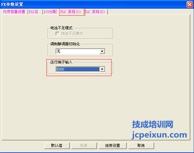 在彈出的PLC參數(shù)對話框中選擇里面的PLC系統(tǒng)(1),在里面把運行端子輸入設(shè)置為X0,如圖所示