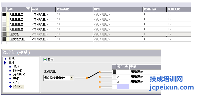第二、對變量進行組態(tài)。在變量里面選擇溫度值,然后在其屬性里面選擇“指針化”,在里面啟用指針化功能,索引變量選擇我們這個“溫度值指針”的變量,而后每一個索引值對應一個溫度值。如圖所示: