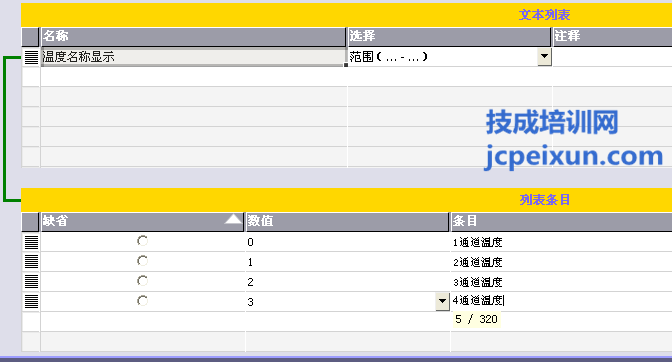 第三、建立一個文本列表,建立文本列表的作用是用來顯示我們當前顯示的溫度的名稱,顯示為哪一個通道的溫度。新建一個文本列表,命名為“溫度名稱顯示”在后面的“選擇”項里面選擇為范圍。組態(tài)好下面的列表條目,當數(shù)值等于0的時候顯示為1通道溫度值。數(shù)字等于1的時候顯示為2通道溫度值……依次組態(tài)好剩余的列表條目。如圖所示: