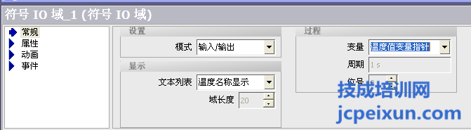 第四、對畫面進行組態(tài),在畫面中拖放一個符號I/O域。對其進行組態(tài),在其屬性的常規(guī)項中把其類型模式設置為“輸入/輸出”,顯示“文本列表”為我們剛才建立的“溫度名稱顯示”文本列表。過程變量選擇建立的變量中的“溫度值變量指針”這個變量。如圖: