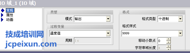 另外在溫度值旁邊建立一個I/O域,用來顯示溫度,在類型中設置為“輸出”模式。變量連接為溫度值,顯示格式為十進制數(shù)。如圖: