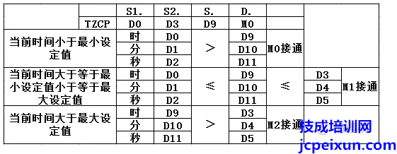 在驅(qū)動(dòng)條件成立的條件下,把S.(D0)為首的連續(xù)三個(gè)寄存器所表示的當(dāng)前時(shí)間和設(shè)定的S1.(K10)時(shí):S2.(K15)分:S3.(K30)秒做比較,比較結(jié)果通過(guò)D.(M0)為首的連續(xù)三個(gè)輔助繼電器體現(xiàn)。