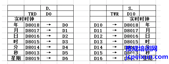 在驅(qū)動(dòng)條件成立時(shí),把PLC內(nèi)實(shí)時(shí)時(shí)鐘寄存器的實(shí)時(shí)時(shí)鐘數(shù)據(jù)通過(guò)TRD指令讀取出來(lái),存放在D.(D0)為首的連續(xù)七個(gè)寄存器中。