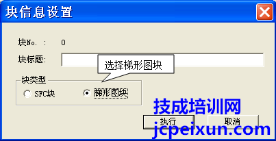 SFC程序從初始狀態(tài)S0開(kāi)始,所以,編程的步是給初始狀態(tài)設(shè)置啟動(dòng)條件。在SFC程序中,初始狀態(tài)的啟動(dòng)采用梯形圖方式。在“塊列表窗口”雙擊第0塊,彈出“塊信息設(shè)置”對(duì)話框,如圖3所示。