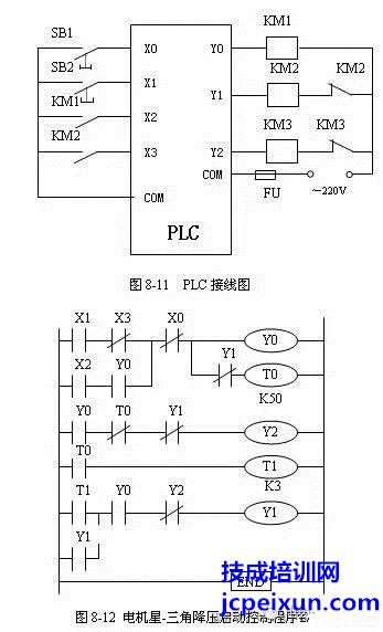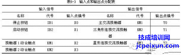 圖8-11中,電路主接觸器KM和三角形全壓運行接觸器的動合輔助觸點作為輸入信號接于PLC的輸入端,便于程序中對這兩個接觸器的實際動作進行監(jiān)視,通過程序以保證電機實際運行的安全。PLC輸出端保留星形和三角形接觸器線圈的硬互鎖環(huán)節(jié),程序中也要另設軟互鎖。