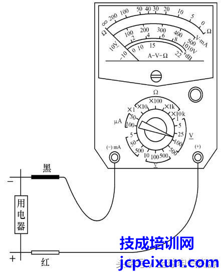 ② 測(cè)量方法。將萬(wàn)用表與被測(cè)電路串聯(lián),應(yīng)將電路相應(yīng)部分?jǐn)嚅_(kāi)后,將萬(wàn)用表表筆接在斷點(diǎn)的兩端。如是直流電流,紅表筆接在與電路的正極相連的斷點(diǎn),黑表筆接在與電路的負(fù)極相連的斷點(diǎn)。如圖3所示.