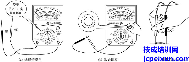 ② 歐姆調(diào)零。將紅、黑表筆短接,如萬(wàn)用表指針不能滿(mǎn)偏(指針不能偏轉(zhuǎn)到刻度線(xiàn)右端的零位),可進(jìn)行“歐姆調(diào)零”,如圖5(b)所示。