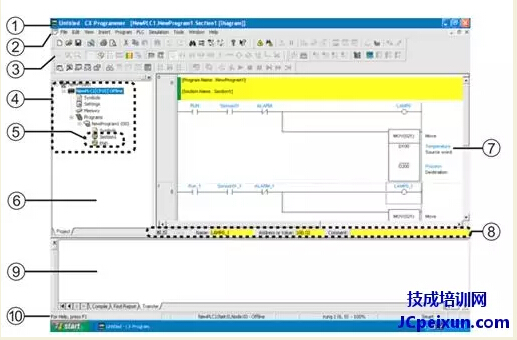 本節(jié)中描述了CX-Programmer主窗口中的各個部分名稱和功能(如圖2-4,2-5)。關(guān)于CX-Programmer功能和操作的詳細信息,請參考CX-Programmer在線幫助。