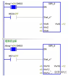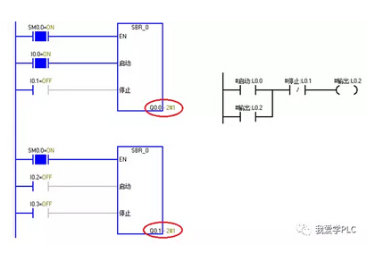 他在學習帶參數(shù)子程序的編寫,編寫了一個簡單的帶參數(shù)的子程序,但是發(fā)現(xiàn)在調用時,個子程序執(zhí)行后,第二個子程序也會有輸出,他不知道是為什么?程序很簡單,是我們編程程序經(jīng)常會用到的一個起保停電路。程序運行結果如下圖所示程序中,I0.0接通后,Q0.0輸出為1,Q0.1不應該為1的卻也為1了。(左側為主程序,右側為子程序)。