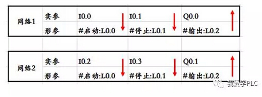 眾所周知PLC的掃描是從上往下周期型掃描的,所以PLC在執(zhí)行程序的時候,會先執(zhí)行網(wǎng)絡1,然后在執(zhí)行網(wǎng)絡2的程序,所以當執(zhí)行網(wǎng)絡1的程序的時候,會把實參的狀態(tài)傳遞到子程序的形參中,所以對于網(wǎng)絡1的程序來講,形式參數(shù):“#啟動:L0.0”=I0.0,“#停止:L0.1”=I0.1 而實參Q0.0=“#輸出:L0.2”
