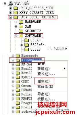 d、點擊HKEY_LOCAL-MACHINE前面的加號;在打開的文件夾中找到SOFTWARE,點擊前面的加號;找到MITSUBISHI,并點擊鼠標(biāo)右鍵,將該文件夾刪除。