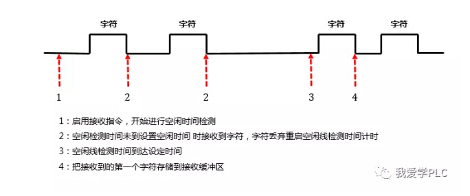 若在啟用了接收指令后,開始檢查傳輸線路中空閑線的時間,但在空閑線的設(shè)定的時間內(nèi)接收到字符,這時PLC會認(rèn)為這并不是一個完整的消息,可能接受到的是一條信息中某個段的數(shù)據(jù),所以不把他作為一個有效的數(shù)據(jù),PLC會丟棄接收到的這個字符然后重新啟用空閑線檢測。過程如下圖所示: